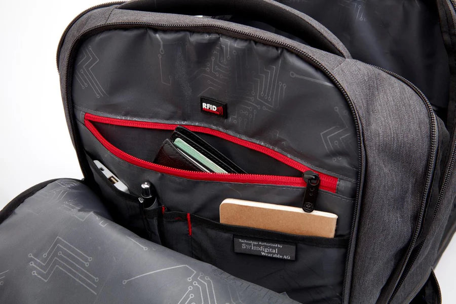RFID PROTECTION POCKET: Travel without worries. The RFID protection compartment protects your personal data from being accessed by RFID scanners (e.g. credit cards, passports and driver’s licenses).